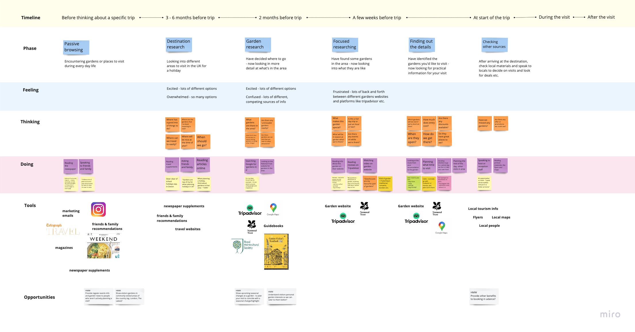 We ran a 1 day workshop to share inspiration and ideas, and create solutions to effectively serve garden visitors and make the most of our garden data. We looked to examples from the wider tourism sector, including travel and mapping products and services that we could learn from. We also highlighted the key areas where we could improve the garden discovery and visit journey, selecting key ‘How Might We’ questions to address with our solutions - such as “HMW… Show upcoming seasonal changes at a garden, so you can plan your visit to coincide with a seasonal change/highlight?”